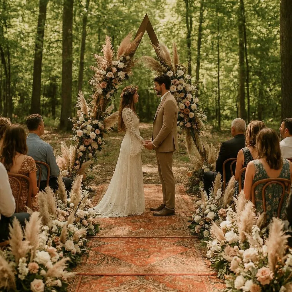 Decor is usually earth tones, neutrals to jewel tones with lots of texture. Pampas grass, wildflowers and dried preserved flowers and grasses are perfect for this style.